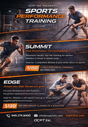 At Orange County Physical Therapy, our Sports Performance Training programs are customized for athletes of all ages and skill levels. Our expert team focuses on improving mobility, strength, coordination, and sport-specific movements to give you a competitive edge while keeping your body healthy and resilient. Train smarter. Perform better. To learn more or schedule your first session, call us today at (949) 777-5301.